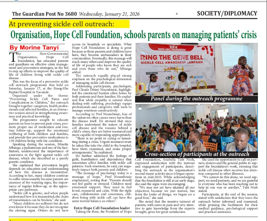 In an effort to ease this burden, Hope Cell Foundation (HCF) and its partners reached out to over 150 children living with sickle cell disease with free routine medications, including folic acid and penicillin. This initiative was part of the Care Before Crisis Sickle Cell Awareness Campaign, held in Yaoundé on Saturday, January 17, 2026.